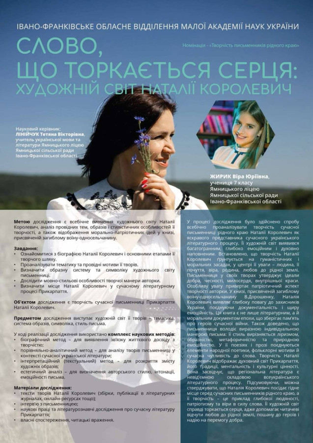 Та вітаємо Віру ЖИРИК, ученицю 7-Б класу, яка зайняла ІІІ місце у Обласному конкурсі дослідницьких проєктів для учнів 6-7 класів (Номінація «Творчість письменників рідного краю»). Дівчина успішно захистила проєкт на тему : «Слово, що торкається серця: художній світ Наталії Королевич» Наталія Королевич .