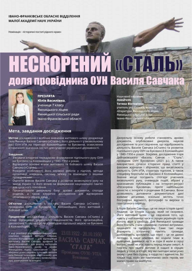 Вітаємо Юлію ПРЕЗЛЯТУ, ученицю 7-Б класу, яка зайняла ІІ місце у Обласному конкурсі дослідницьких проєктів для учнів 6-7 класів (Номінація «Історичні постаті рідного краю»). Вона успішно захистила проєкт на тему : «Нескорений «Сталь»: доля провідника ОУН Василя Савчака».