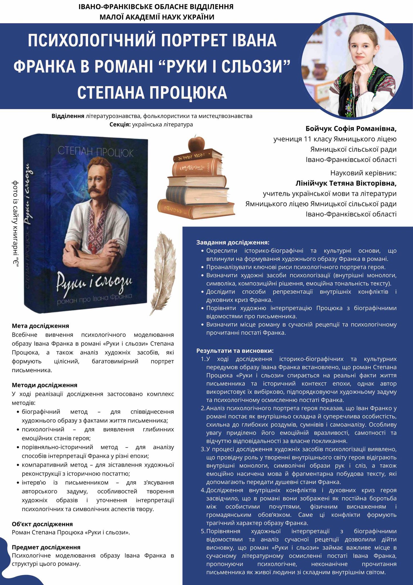 Вітаємо Софію БОЙЧУК, ученицю 11 класу, та її наукового керівника Тетяну Вікторівну ЛІНІЙЧУК із зайнятим ІІ місцем у ІІ етапі (обласному) Всеукраїнського конкурсу-захисту науково-дослідницьких робіт учнів-членів Малої академії наук України!!! Софія презентувала поважним членам журі дослідження на тему : «Психологічний портрет Івана Франка в романі «Руки і сльози» Степана Процюка» (Відділення літературознавства, фольклористики та мистецтвознавства; секція-Українська література).